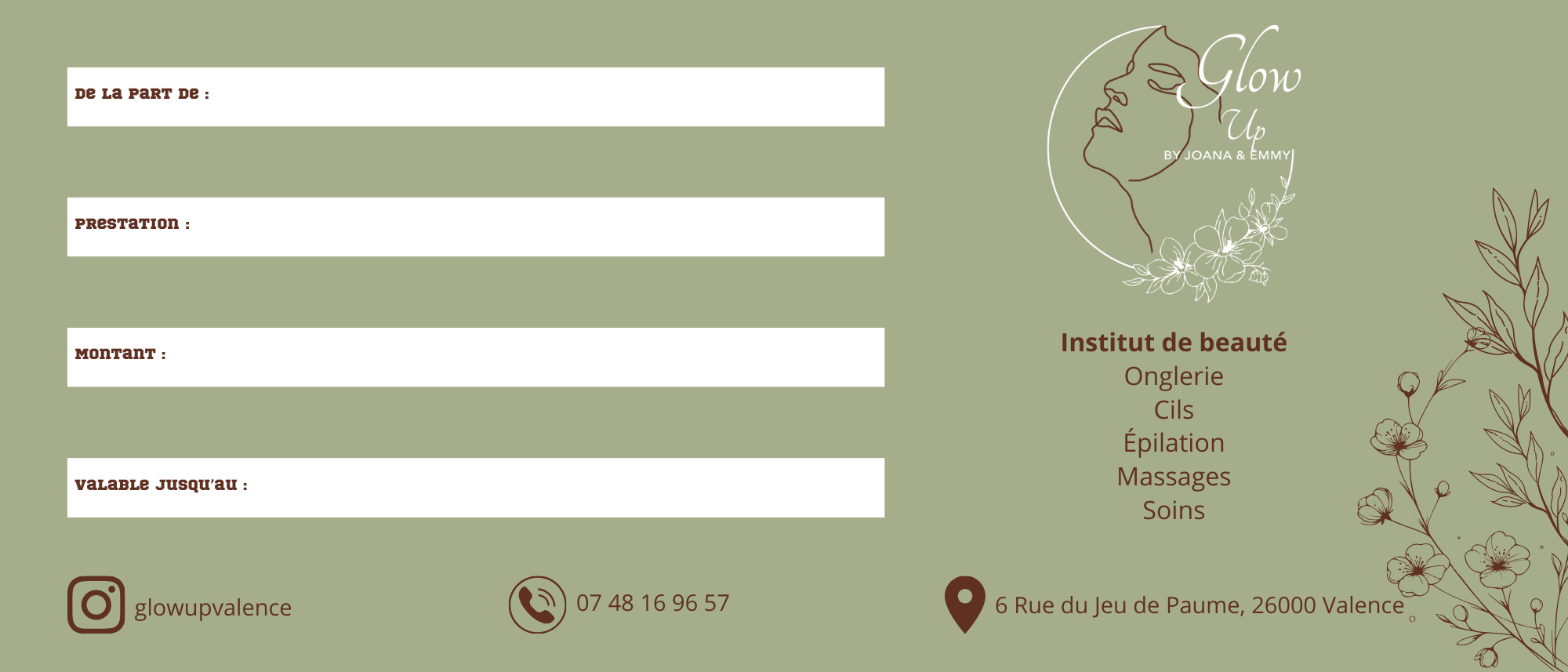 Chez Glow Up, nous vous proposons des chèques cadeaux personnalisables pour faire plaisir à vos proches en toute occasion : anniversaire, fête, remerciement ou simplement pour faire plaisir.